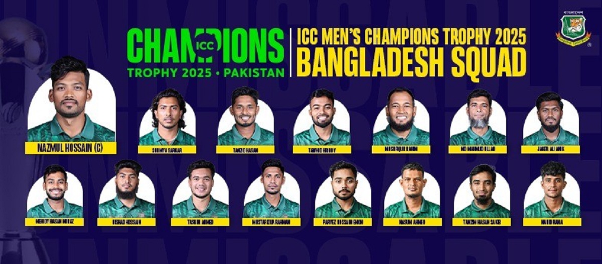 काठमाण्डु- आईसीसी च्याम्पियन्स ट्रफीका लागि बङ्गलादेशको टोली घोषणा भएको छ । च्याम्पियन्स ट्रफीका लागि नजमुल होसेनको कप्तानीमा बङ्गलादेश क्रिकेट बोर्डले १५ सदस्यीय टोली घोषणा गरेको हो ।