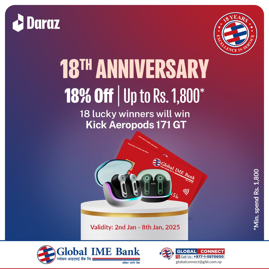 पुस १८ गते बिहीबारदेखि ग्लोबल आईएमई बैंकले आफ्नो स्थापनाको १८औं वर्ष पूरा गर्दैछ । छुट योजना पुस १८ गते बिहीबारदेखि पुस २४ गते बुधबारसम्म रहनेछ ।