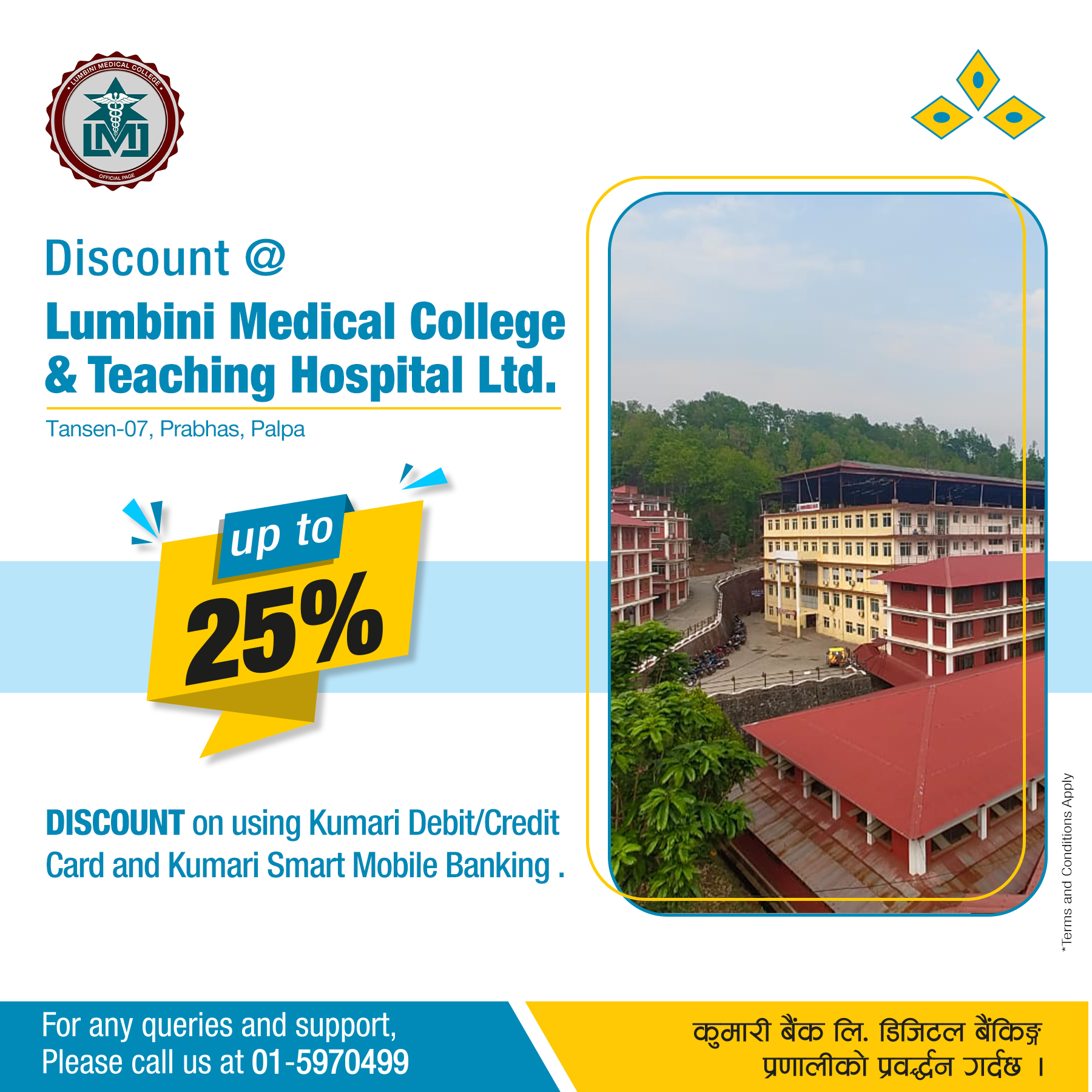 काठमाण्डु – कुमारी बैंक लिमिटेड र लुम्बिनी मेडिकल कलेज एण्ड टिचिङ हस्पिटल लिमिटेड पाल्पाबीच कुमारी बैंक लिमिटेडका ग्राहकलाई हस्पिटलबाट प्रदान गरिने सेवामा विशेष छुट प्रदान गर्ने सम्झौता भएको छ ।