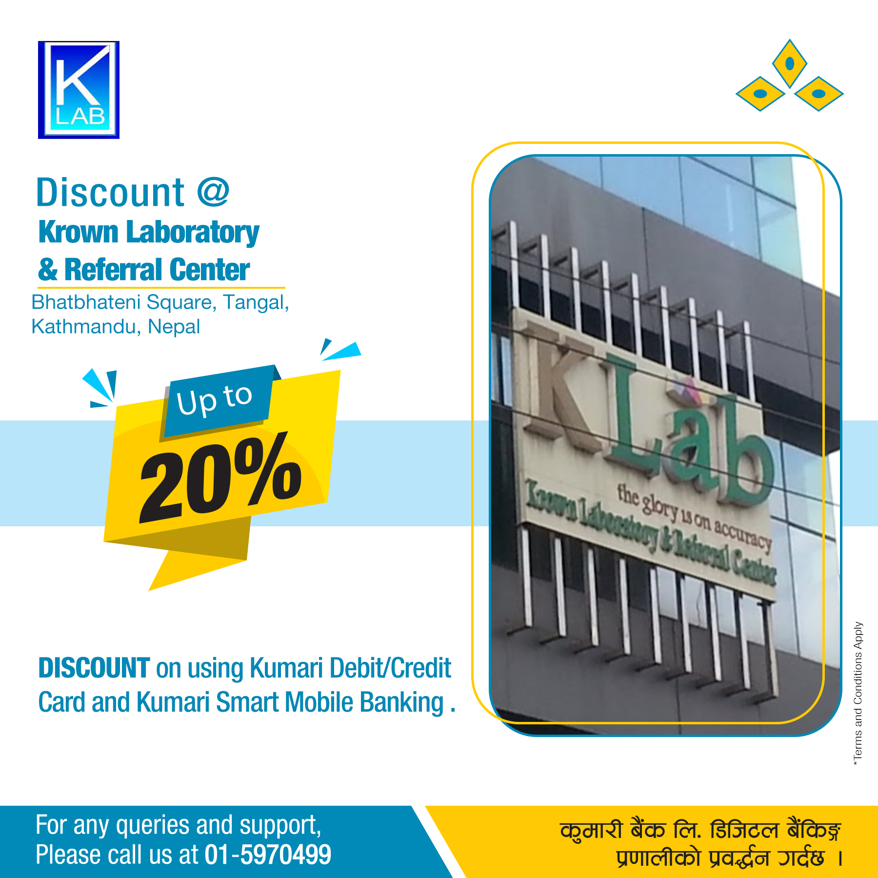 काठमाण्डु – कुमारी बैंक लिमिटेड र भाटभटेनी टंगाल काठमाण्डुस्थित क्राउन ल्याबोरेटोरी तथा रेफरल केन्द्र (के ल्याब) बीच कुमारी बैंक लिमिटेडका ग्राहकलाई ल्याबबाट प्रदान गरिने विभिन्न सेवामा विशेष छुट प्रदान गर्ने सम्झौता भएको छ ।