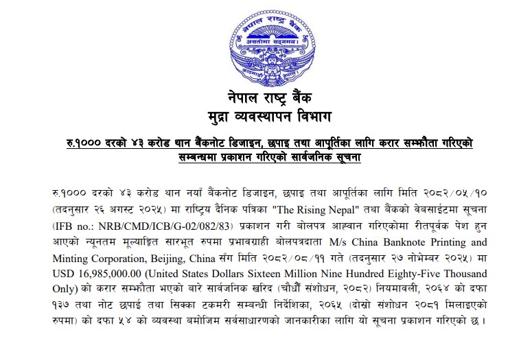 नेपाल राष्ट्र बैंकले एक हजार दरका ४३ करोडनयाँ नोट छाप्न चिनियाँ कम्पनीलाई ठेक्का दिएको छ। यसका लागि राष्ट्र बैंकले गत भदौ १० गते बोलपत्र आह्वान गरेको थियो। सम्झौताअनुसार उक्त कम्पनीले १ करोड ६९ लाख ८५ हजार डलरमा नोट छाप्नेछ।