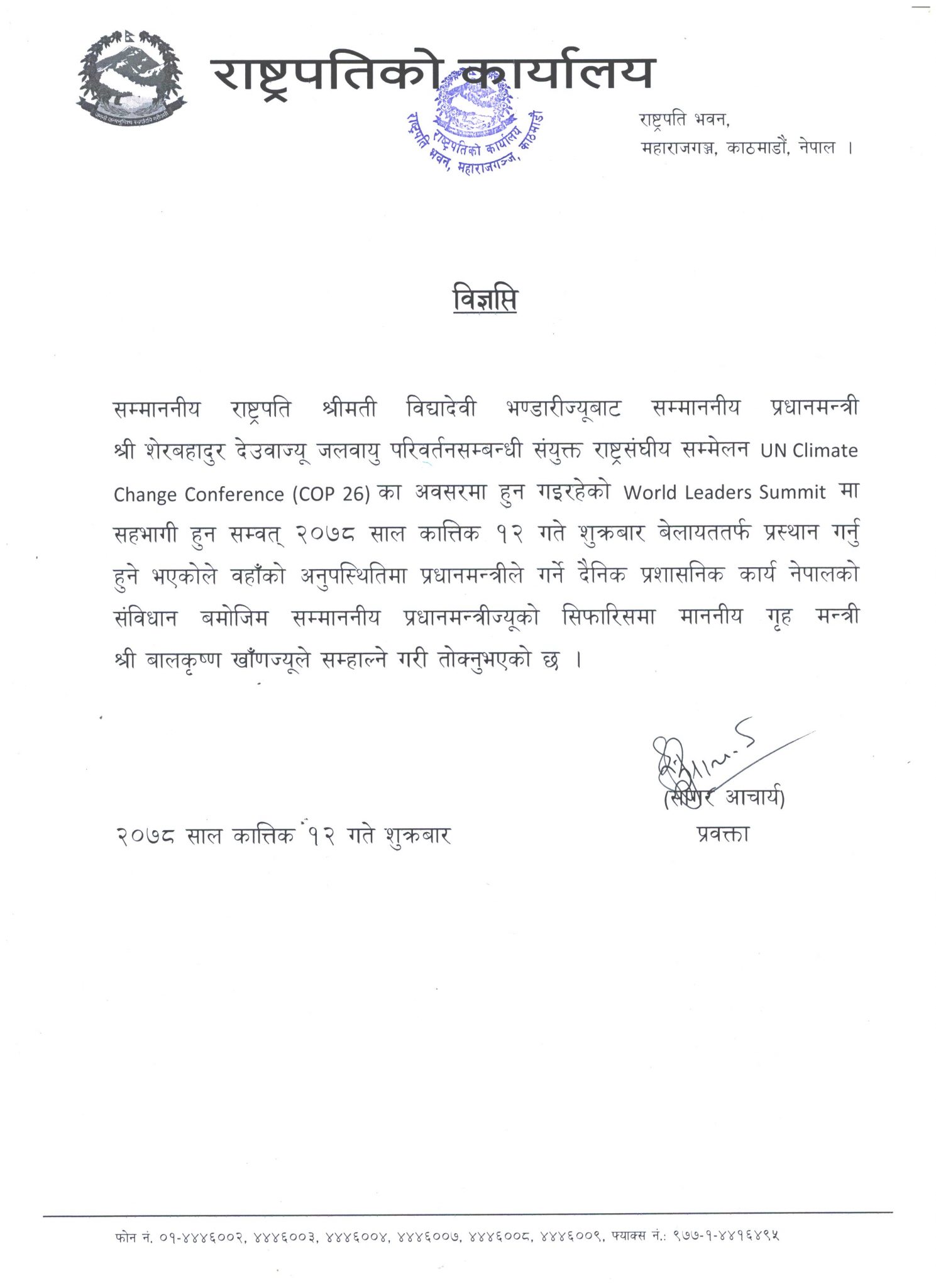 प्रधानमन्त्री देउवाको सिफारिसमा राष्ट्रपति भण्डारीले खाँडलाई कार्यवाहक प्रधानमन्त्रीको जिम्मेवारी दिएको राष्ट्रपति कार्यालयका प्रवक्ता सागर आचार्यले जानकारी दिए ।