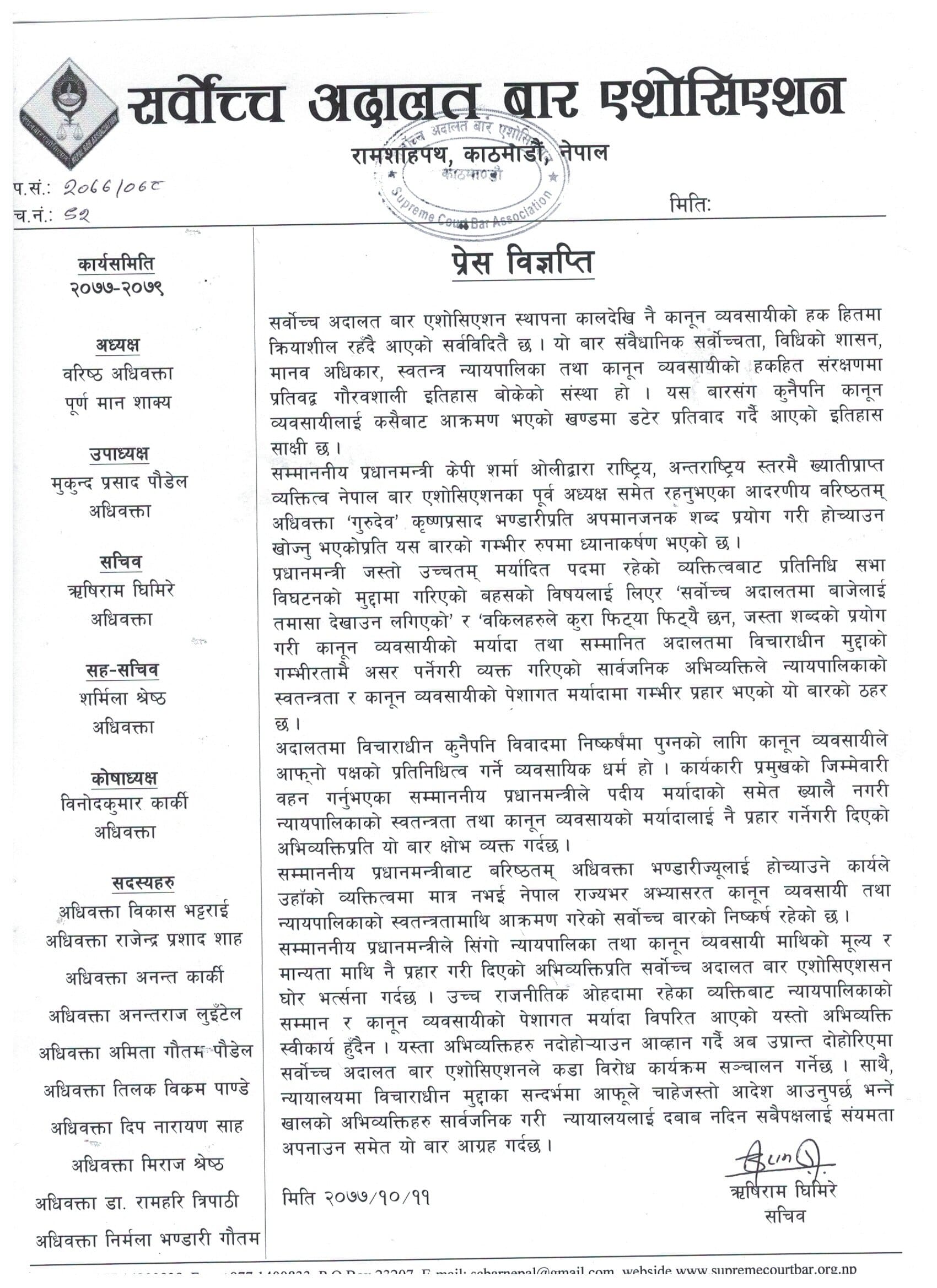 ‘प्रधानमन्त्रीले सिंगो न्यायपालिका तथा कानून व्यवसायी माथिको मूल्य र मान्यतामाथि नै प्रहार गरी दिएको अभिव्यक्तिप्रति सर्वोच्च अदालत बार एशोसिएसन घोर भत्र्सना गर्दछ । उच्च राजनीतिक ओहदामा रहेका व्यक्तिबाट न्यायपालिकाको सम्मान र कानून व्यवसायीको पेशागत मर्यादा विपरित आएको यस्तो अभिव्यक्ति स्वीकार्य हुँदैन’, विज्ञप्तिमा भनिएको छ ।