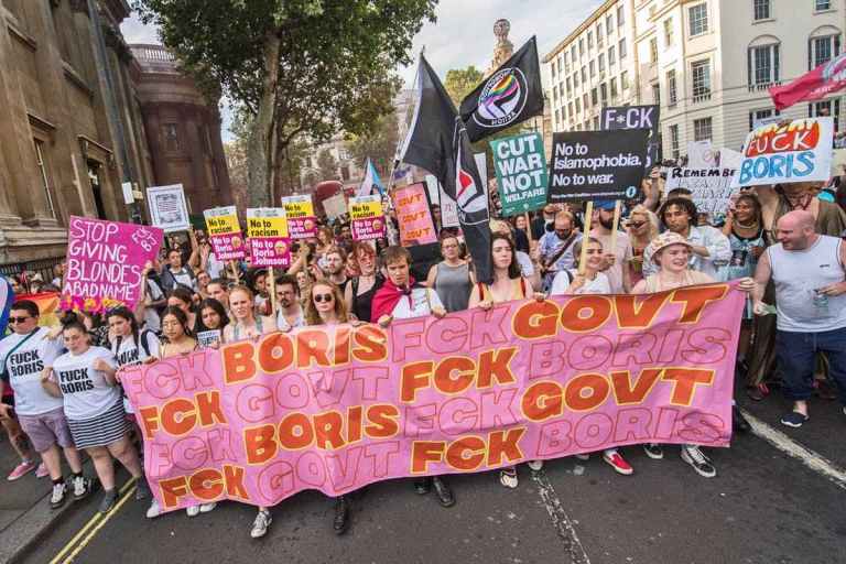 प्रदर्शनकारीहरुले ‘संसद निलम्बन फिर्ता गर,’ ‘लोकतन्त्रको रक्षा गर,’ जस्ता नारा लेखिएका घरमै निर्मित प्लेकार्ड प्रदर्शन गरेका थिए । प्रदर्शनमा सहभागी बेलायती छायाँ अर्थमन्त्री जोन म्याकडोनेलले संसद निलम्बन गर्नुलाई लोकतन्त्र मास्ने प्रयासको संज्ञा दिए ।