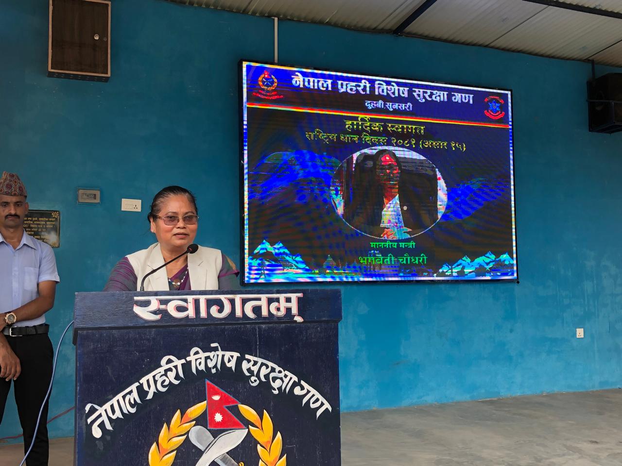 शनिबार नेपाल प्रहरी विशेष सुरक्षा गण दुहबी सुनसरीले राष्ट्रिय धान दिवसको अवसरमा आयोजना गरेको विशेष कार्यक्रमलाई सम्बोधन गर्दै मन्त्री चौधरीले शान्ति सुरक्षा कायम गर्नका निम्ति सुरक्षा निकायको विशेष भूमिका रहेको बताइन् ।