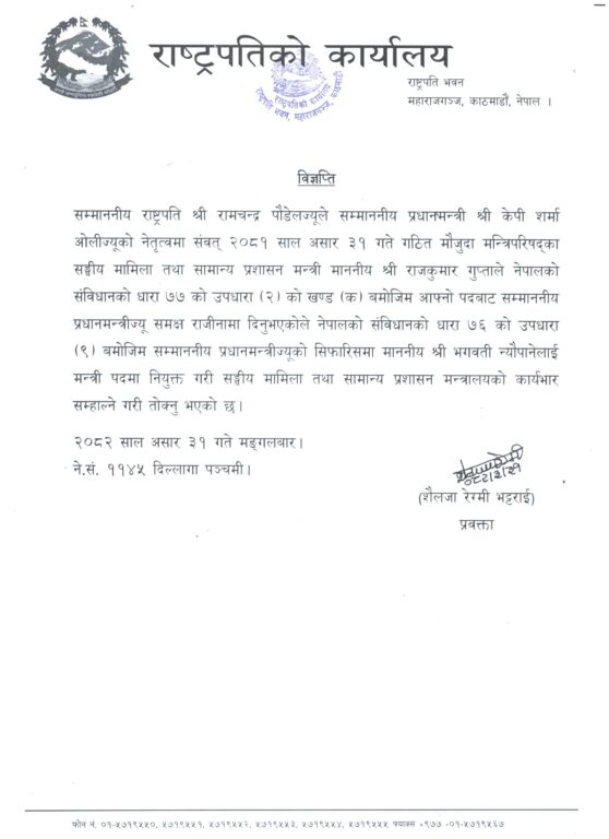 प्रधानमन्त्री केपी शर्मा ओलीको सिफारिसमा राष्ट्रपति रामचन्द्र पौडेलले उनलाई मंगलबार मन्त्री नियुक्त गरेका छन् ।
