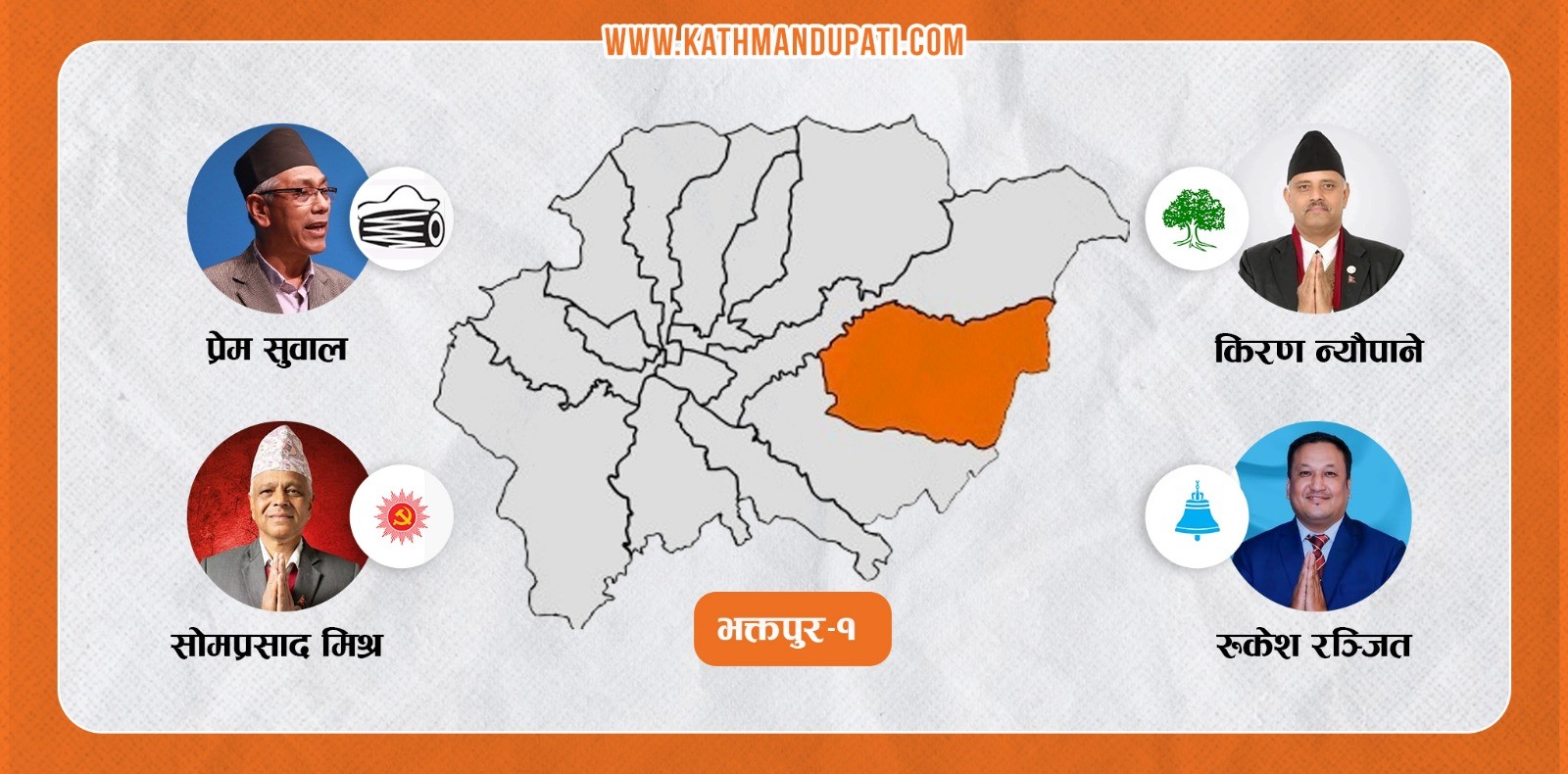 यसपटक यस क्षेत्रमा नेपाली कांग्रेसले नेपाल बार एशोसिएसन भक्तपुरका पूर्व अध्यक्ष किरण न्यौपाने र एमालेले चाँगुनारायण नगरपालिकाका पूर्व मेयर सोमप्रसाद मिश्रलाई मैदानमा उतारेको छ ।