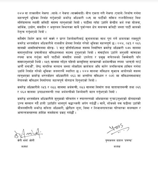 पार्टी अध्यक्षद्वय केपी शर्मा ओली र पुष्पकमल दाहाल ‘प्रचण्ड’ले केहीबेरअघि संयुक्तरूपमा शोक वक्तव्य जारी गरेर स्वर्गीय अधिकारीले मुलुकको परिवर्तन र रूपान्तरणको अभियानमा पु¥याउनुभएको योगदानको उच्च सम्मान गरेका हुन् ।
