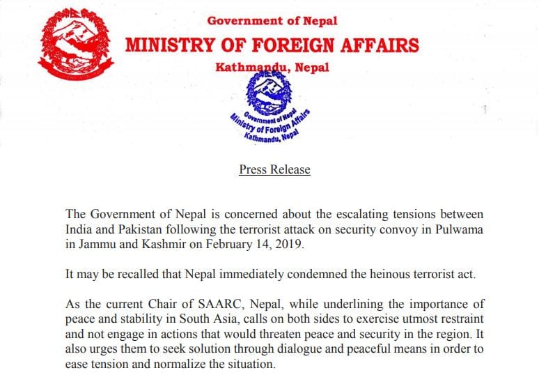 नेपाल सरकारले तनावग्रस्त भारत(पाकिस्तान दुवैसँग अत्यन्तै संयमता अपनाउन र यस क्षेत्रको शान्ति र सुरक्षामा खतरा र्पुयाउने कुनै पनि गतिविधिमा नलाग्न दुवै देशलाई आग्रह गरेको हो । नेपालले दक्षिण एसियाली क्षेत्रीय सहयोग संगठन (सार्क)को अध्यक्षको हैसियतमा दक्षिण एसियामा शान्ति र स्थायित्वको महत्वलाई आत्मसाथ गर्दै भारत र पाकिस्तान दुवैसँग संयम हुन परराष्ट्र मन्त्रालयले पत्रमार्फत आग्रह गरेको छ ।