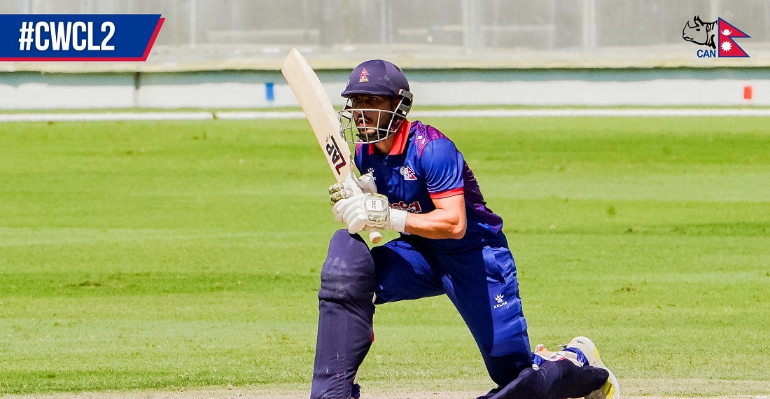 नेपाली खेलाडी भीम सार्की १७ बलमा ७ रन बनाएर आउट भएका छन् । रविन्द्र जडेजाको बलमा उनी आउट भएका हुन् ।