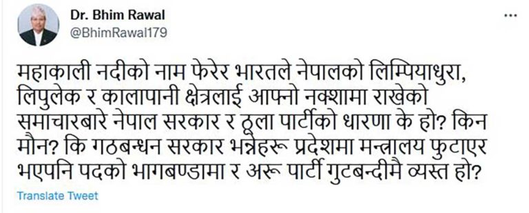 पूर्वमन्त्री समेत रहेका रावलले सामाजिक सञ्जाल ट्वीटरमार्फत महाकाली नदीको नाम फेरेर भारतले नेपालीको लिम्पियाधुरा र लिपुलेक र कालापानीको क्षेत्रलाई आफ्नो नक्सामा राख्दा पनि सरकार मौन बसेको भन्दै आक्रोश व्यक्त गरेका हुन् ।