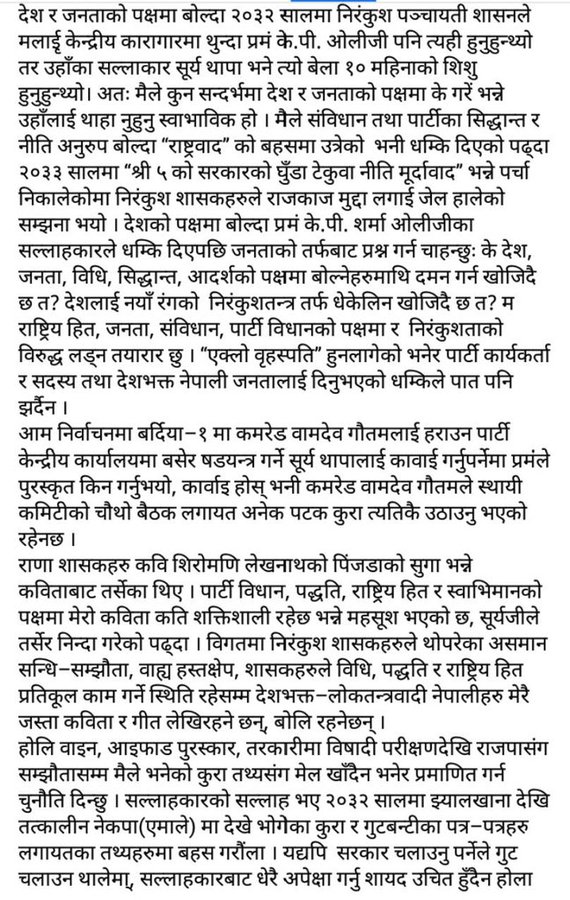 ‘गत आम निर्वाचनमा बर्दिया निर्वाचन क्षेत्र बाट नेकपाको उम्मेदवार हुनुभएका कमरेड वामदेव गौतमलाई हराउनका लागि पार्टी केन्द्रीय कार्यालयमा बसेर षडयन्त्र गर्ने सूर्य थापालाई कावाई गर्नुपर्नेमा प्रधानमन्त्रीले पुरस्कृत किन गर्नुभयो, कारबाही होस् भनेर कमरेड वामदेव गौतमले स्थायी कमिटीको भर्खरै सम्पन्न चौथो बैठक लगायत अनेक पटक कुरा त्यतिकै उठाउनु भएको रहेनछ । निरंकुश राणा शासकहरु कवि शिरोमणि लेखनाथको पिँजडाको सुगा भन्ने कविताबाट तर्सेका थिए । मैले स्थायी कमिटीको बैठकमा प्रस्तुत गरेको कविता पार्टी विधान, पद्धति, राष्ट्रिय हित र स्वाभिमानको पक्षमा कति शक्तिशाली रहेछ भन्ने मलाई महसूश भएको छ, सूर्य थापाजीले तर्सेर निन्दा गरेको पढ्दा । जबसम्म देशमाथि विगतका निरंकुश व्यवस्थाहरुले थोपरेका असमान सन्धि–सम्झौताहरु रहिरहने छन्, नेपालमा वाह्य हस्तक्षे भइरहनेछ, शासकहरु विधि, पद्धति र राष्ट्रिय हित प्रतिकूल काम गरिहने छन् तबसम्म मैले मात्र होइन देशभक्त–लोकतन्त्रवादी नेपालीहरुले मैले लेखेजस्ता कविता र गीत लेखिरहने छन्, मन्तव्य दिइनै रहनेछन् र आवश्यक परेमा अझ सशक्त रुपमा उत्रने छन्’, रावलले थपेका छन् ।