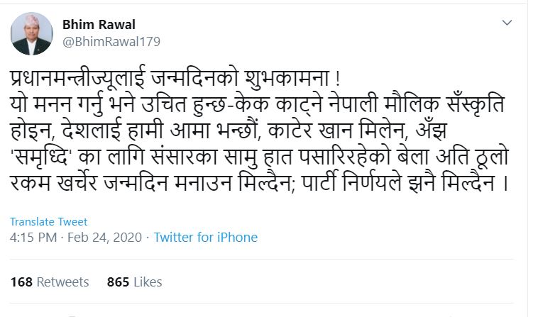 ‘प्रधानमन्त्रीज्यूलाई जन्मदिनको शुभकामना । यो मनन गर्नु भने उचित हुन्छ(केक काट्ने नेपाली मौलिक सँस्कृति होइन, देशलाई हामी आमा भन्छौं, काटेर खान मिलेन’ रावलले ट्वीट गरेका छन् ‘अँझ सम्वृद्धिका लागि संसारका सामु हात पसारिरहेको बेला अति ठूलो रकम खर्चेर जन्मदिन मनाउन मिल्दैन । पार्टी निर्णयले झनै मिल्दैन ।’