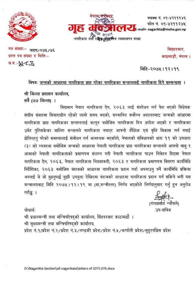 काठमाडौं – गृह मन्त्रालयले मंगलबार (जन्मसिद्ध) नागरिकका सन्तानले आमा र बाबु दुवैको नागरिकता ल्याए नागरिकता बनाइदिन ७७ वटै जिल्ला प्रशासन कार्यलयलाई निर्देशन दिएकोप्रति नेकपाका नेता भीम रावलले आपत्ति जनाएका छन् ।
