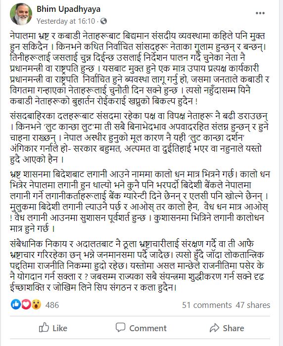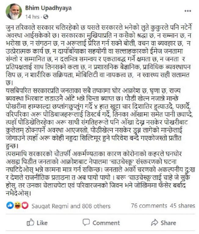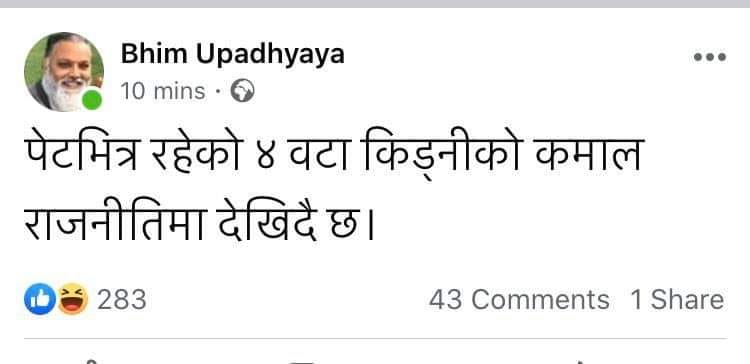 उनले पछिल्लो समय नेता र कर्मचारीलाई लक्षित गरेर पोष्ट गर्ने गरेका थिए । सामािजक सञ्जाल फेलबुकमाफृत उनले भनेका थिए, ‘नेताहरू कर्मचारीको सबैभन्दा ठूलो उत्प्रेरक हुनुपर्नेमा ती नेपालमा कर्मचारीको सबैभन्दा ठूलो प्रतिद्वन्दी बनेका छन् । यहॉ आफ्नो ड्युटी र पेशामा हैन, नेताहरूको खेदाई ब्यवस्थापन गर्नमा नै कर्मचारीको सारा बुद्धि र समय तिगडमबाजीमा खर्चिनु पर्छं ।’