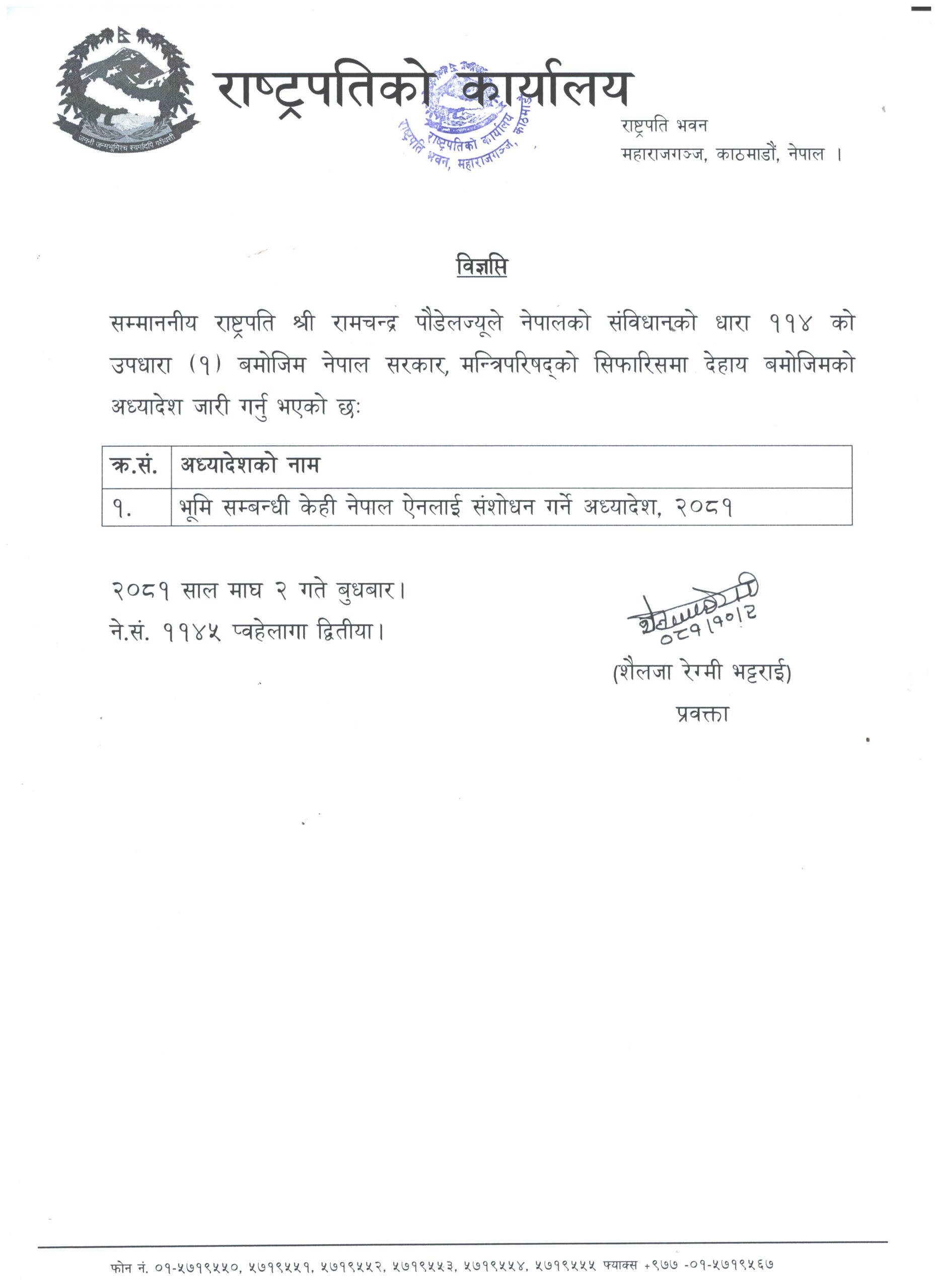 मन्त्रिपरिषद् बैठकको सिफारिसमा राष्ट्रपति पौडेलले भूमि सम्बन्धी केही नेपाल ऐनलाई संशोधन गर्ने अध्यादेश २०८१ जारी गरेका हुन् ।