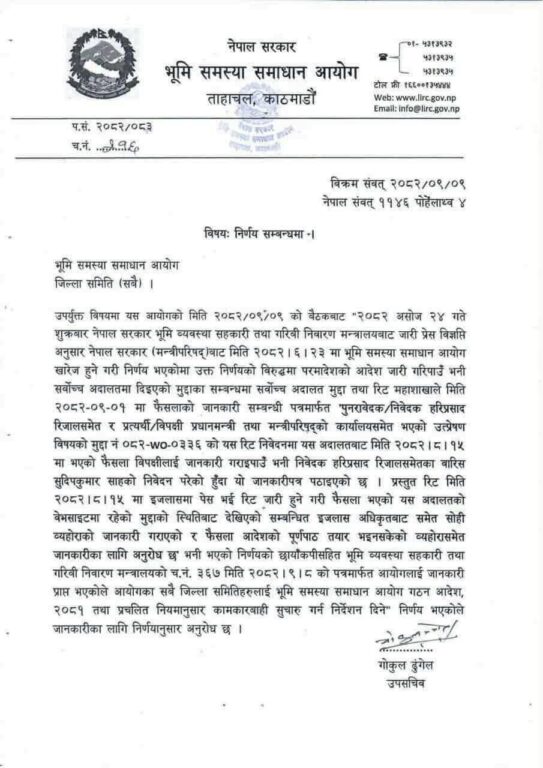काठमाण्डु – भूमि समस्या समाधान आयोगले काम–कारवाही अगाडि बढाउन जिल्ला समितिहरूलाई निर्देशन दिएको छ ।
