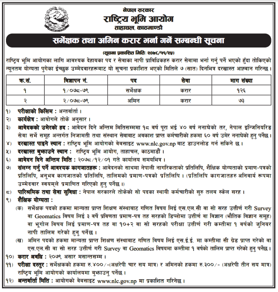 काठमाण्डु – राष्ट्रिय भूमि आयोगले विभिन्न २ पदमा ठूलो संख्यामा कर्मचारीको माग गरेको छ । सर्भेक्षक र अमिन पदमा करारमा काम गर्नका आयोगले १ सय ९९ जना कर्मचारी माग गर्दै आवेदन खुला गरेको हो ।
