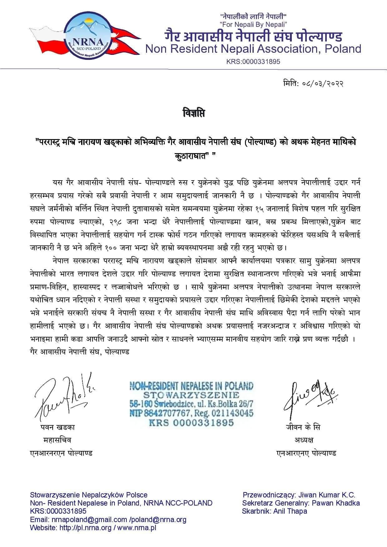 विज्ञप्तिमा पोल्याण्डको गैरआवासीय नेपाली संघले जर्मनीको बर्लिनस्थित नेपाली दूतावासको समेत समन्वयमा युक्रेनमा रहेका १५ जनालाई सुरक्षित रुपमा पोल्याण्ड ल्याएको, २९८ जनाभन्दा धेरै नेपालीलाई पोल्याण्डमा खान, बस्न प्रबन्ध मिलाएको,युक्रेनबाट विस्थापित भएका नेपालीलाई सहयोग गर्न टास्क फोर्स गठन गरिएको उल्लेख छ । संघले एक सय जनाभन्दा बढीलाई आफ्नै व्यवस्थापनमा सहयोग गरिएको जनाएको छ।