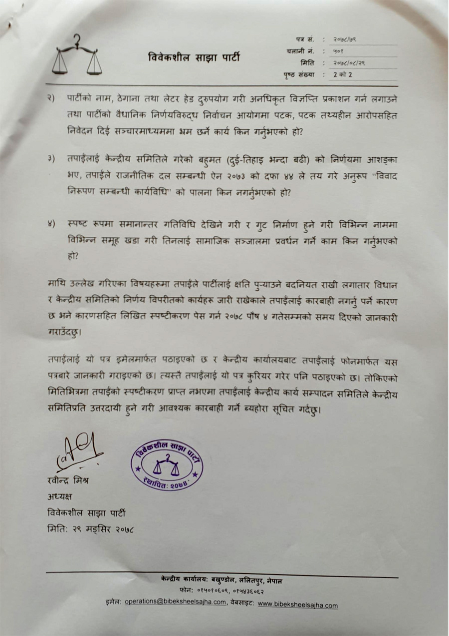 पार्टी अध्यक्ष रवीन्द्र मिश्रले हस्ताक्षर गरेको स्टीकरण पत्रमा पार्टीप्रति आफ्नो जिम्मेवारी बोध नगरी केन्द्रीय समितिका पछिल्ला कयौं बैठकमा लगातार उपस्थित रहने, दुई तिहाइ भन्दा बढी केन्द्रीय सदस्यले बैठकबाट एकमतले गरेका निर्णय अस्वीकार गर्ने र ती निर्णय तथा पार्टी मूल नेतृत्वविरुद्ध अनर्गल र भ्रमपूर्ण प्रचार गरेको आरोप लगाउँदै त्यस्तो कार्य किन गरेको भन्दै प्रश्न गरिएको छ ।