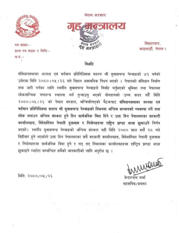 मन्त्रालयका प्रवक्ता सहसचिव केदारनाथ शर्माले मंगलबार विज्ञप्ति जारी गर्दै मन्त्रिपरिषद्को निर्णयअनुसार संविधानसभा अध्यक्ष सुवासचन्द्र नेम्वाङको अन्त्येष्टि हुने दिन बिहीबार बिदा हुने जानकारी दिए ।
