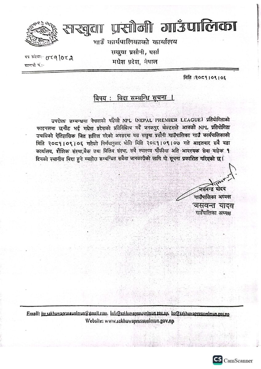 काठमाण्डु – जनकपुर बोल्ट्स्ले नेपाल प्रिमियर लिग (एनपीएल) को उपाधि जित्दै मधेश प्रदेशको नाम राखेको खुशीयालीमा पर्साको सखुवा प्रसौनी गाउँपालिकाले आईतबार स्थानीय बिदा दिने निर्णय गरेको छ ।