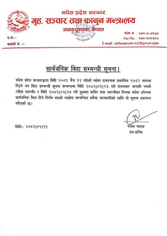 मधेश प्रदेशको गृह मन्त्रालयले आईतबार सूचना जारी गर्दै मंगलबार जानकी नवमी (सीता जयन्ती) र आगामी जेठ २८ गते कविर दास जयन्तीका अवसरमा सार्वजनिक बिदा दिने निर्णय गरेको जनाएको छ ।