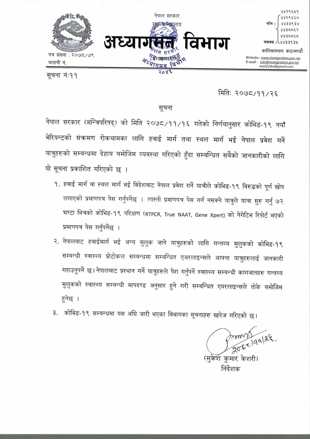 हवाई मार्ग वा स्थलमार्ग भइ विदेशबाट नेपाल प्रवेश गर्ने यात्रुको सम्बन्धमा कोभिड १९ को जोखिम विश्लेषण आवश्यकतानुसार परीक्षण गर्ने, थप कडाइ गर्ने वा नगर्ने निर्णय अब कोभिड १९ संकट व्यवस्थापन केन्द्रबाटै हुने विभागले जनाएको छ ।