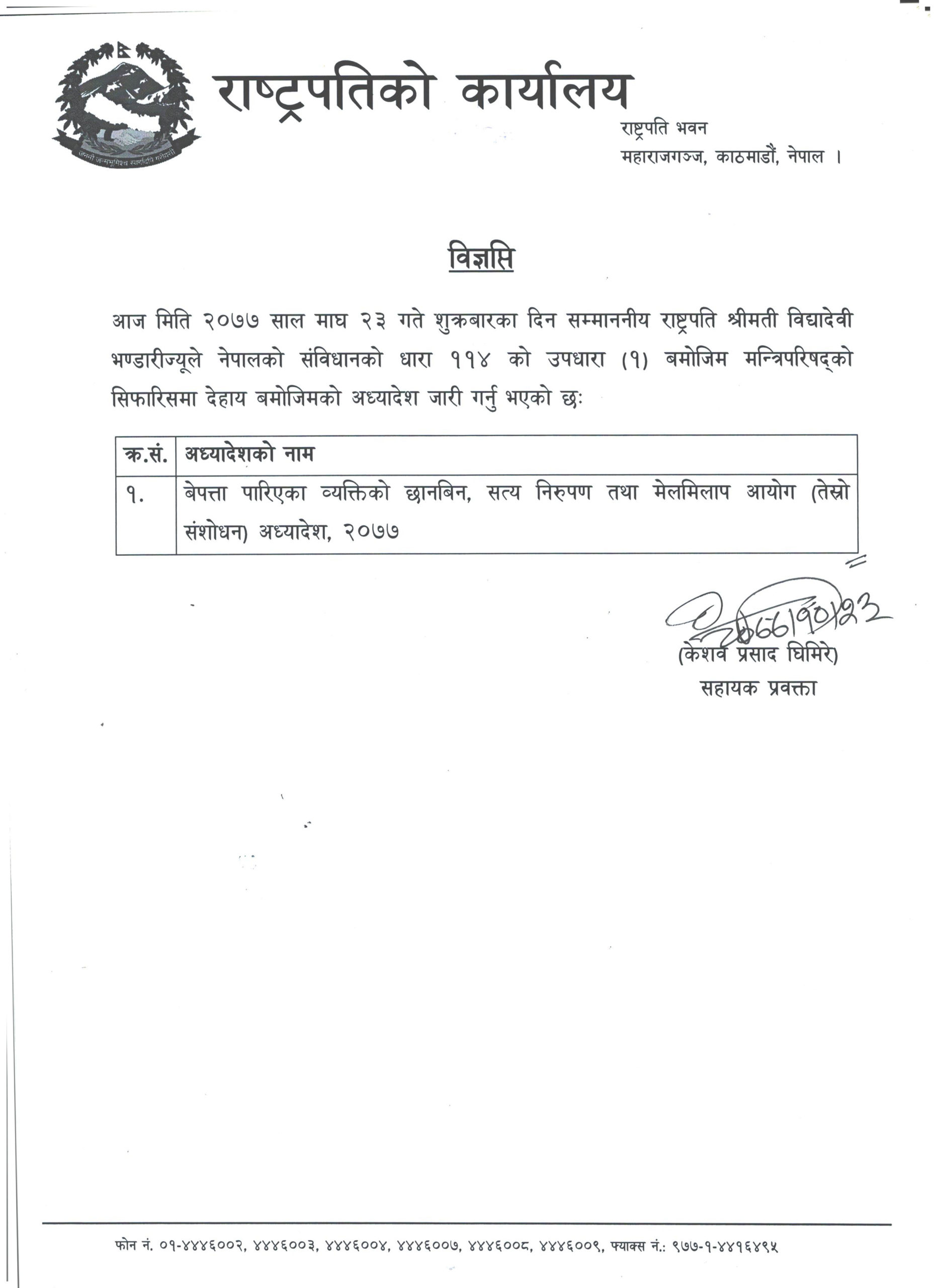 मन्त्रिपरिषद्को सिफारिसमा राष्ट्रपतिले शुक्रबार नेपालको संविधानको धारा ११४ को उपधारा (१) बमोजिम सो अध्यादेश जारी गरेको राष्ट्रपति कार्यालयले जनाएको छ ।