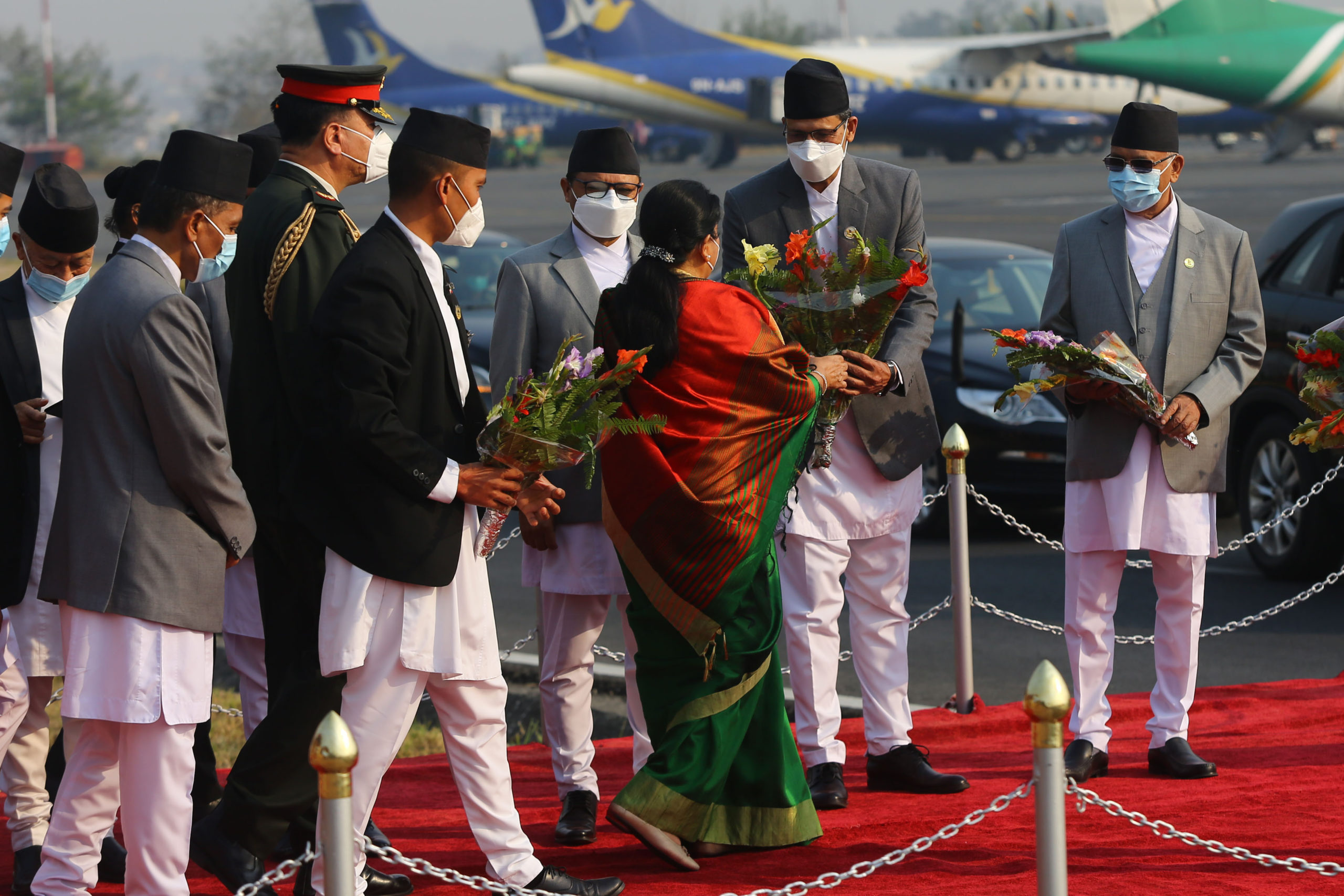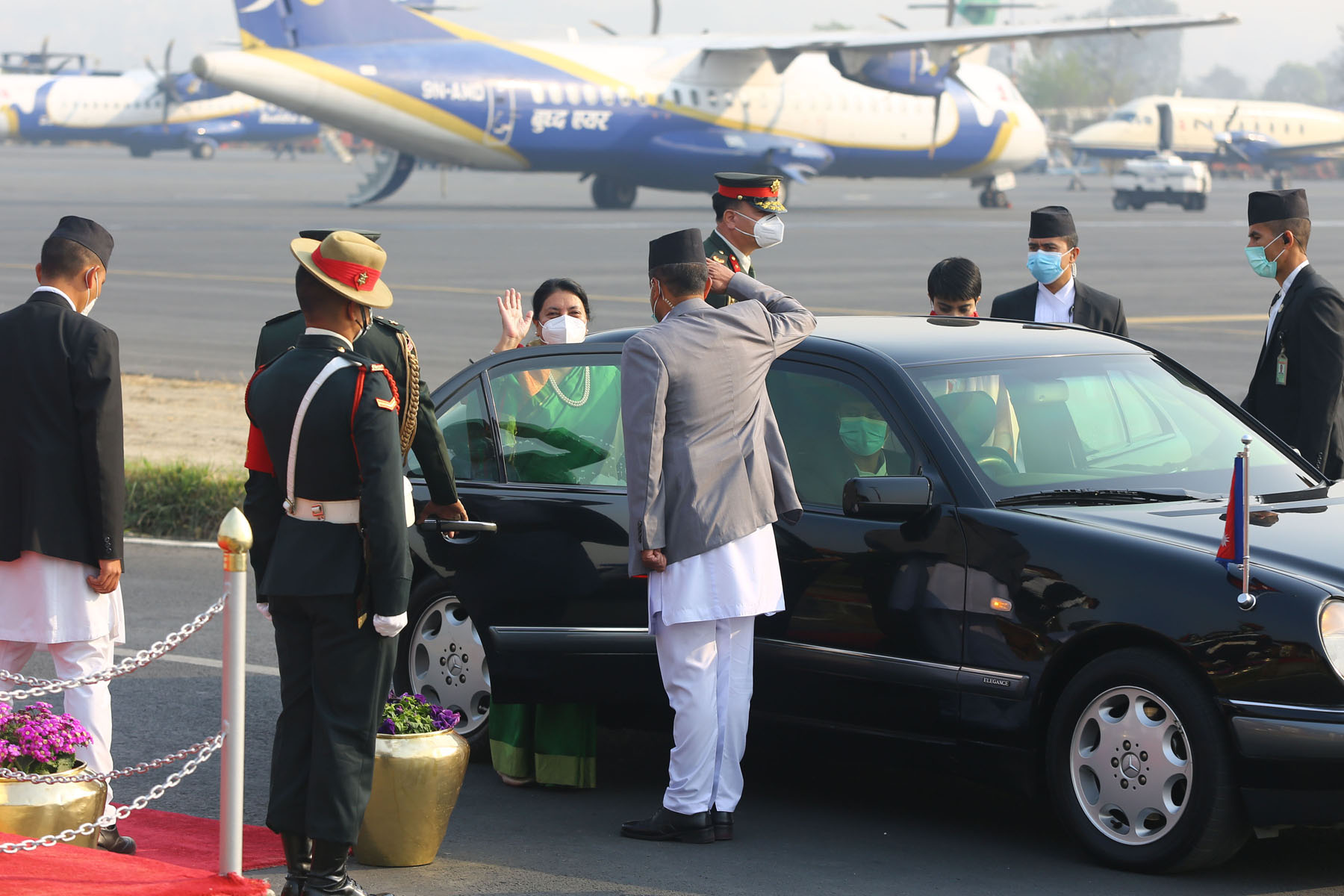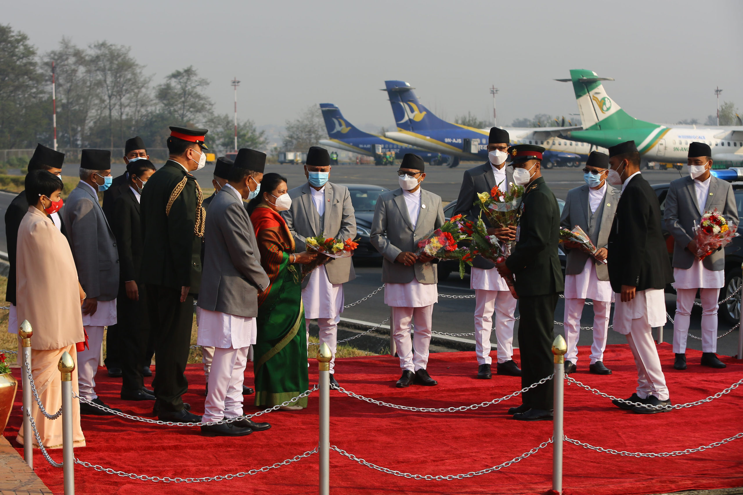 उनलाई त्रिभुवन अन्तर्राष्ट्रिय विमानस्थलको अतिविशिष्ट कक्षमा उपराष्ट्रपति नन्दबहादुर पुन, प्रधानमन्त्री केपी शर्मा ओली, सभामुख अग्निप्रसाद सापकोटा, राष्ट्रियसभाका अध्यक्ष गणेशप्रसाद तिमिल्सिना, उपप्रधानमन्त्री ईश्वर पोखरेल र संविधानसभा अध्यक्ष सुवासचन्द्र नेम्वाङले बिदाइ गरे ।