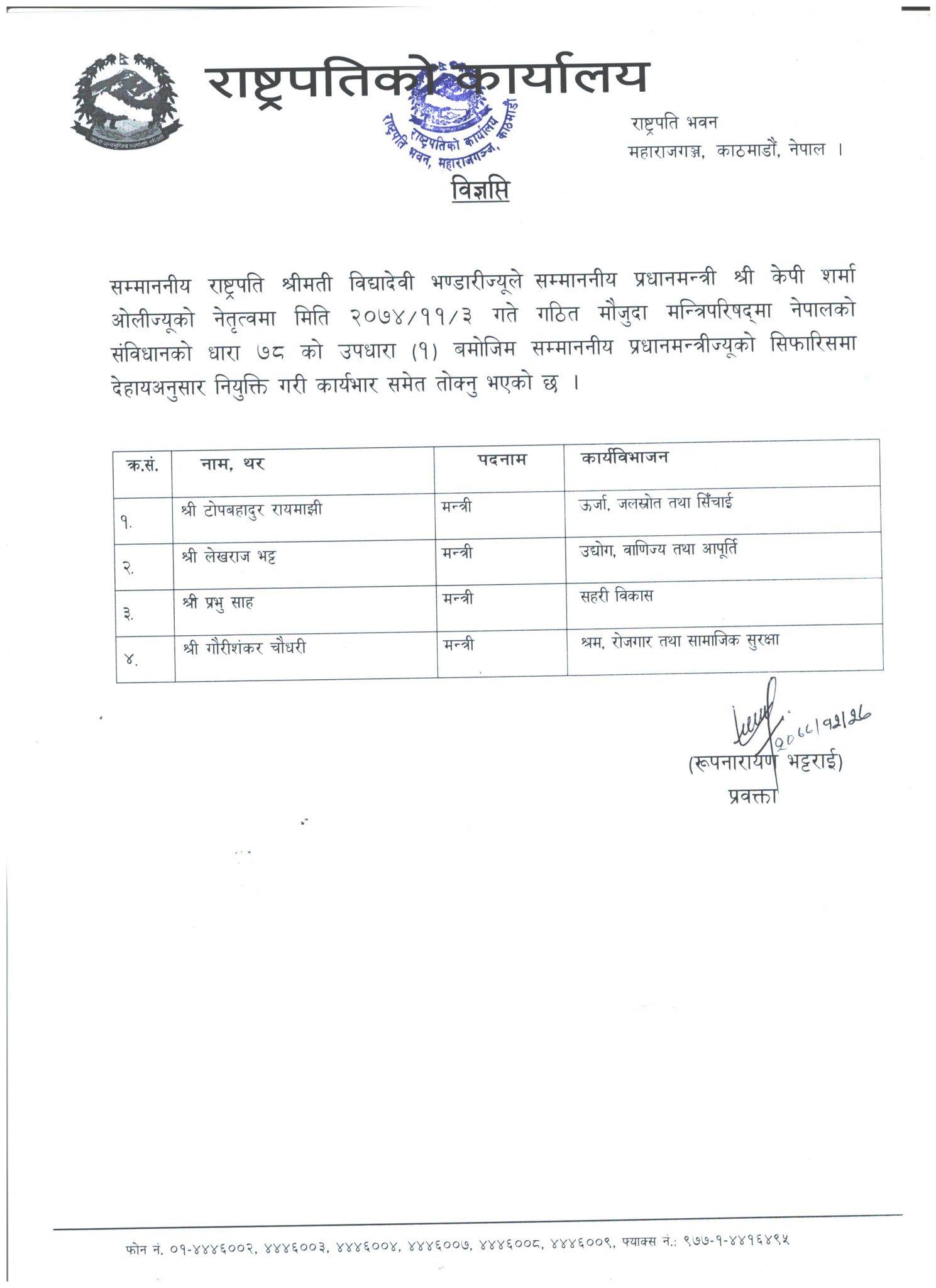 प्रवक्ता रुपनारायण भट्टराईले राष्ट्रपति भण्डारीले प्रधानमन्त्री केपी शर्मा अ‍ोलीको सिफारिसमा संविधानको धारा ७८ को उपचार (१) बमोजिम चार जनालाई पुनः मन्त्री पदमा नियुक्त गरेको जानकारी दिए । उनीहरूकाे सपथग्रहण साँझ ५ बजे रहेकाे राष्ट्रपति कार्यालयले जनाएकाे छ ।