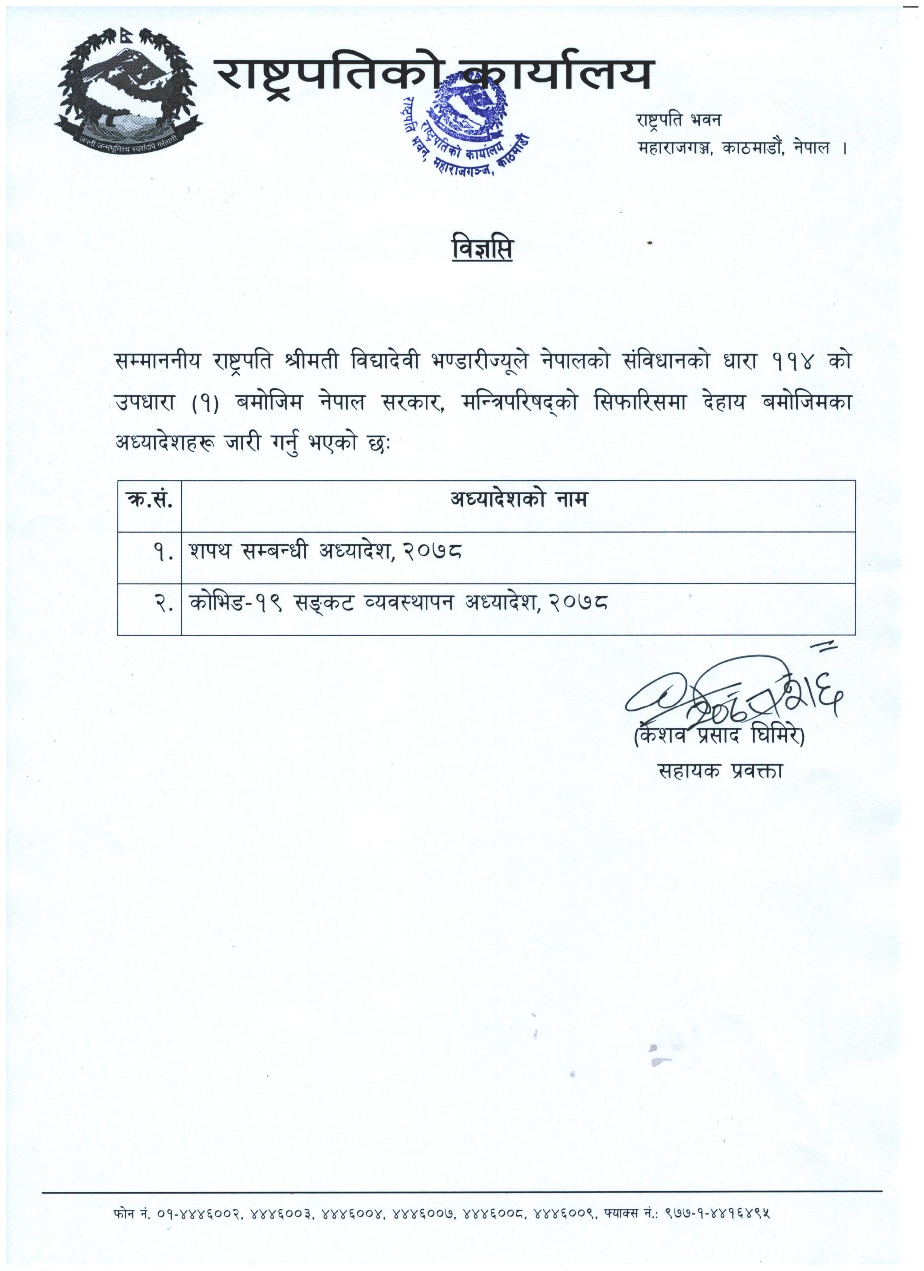 नेपालको संविधानको धारा ११४ को उपधारा (१) बमोजिम मन्त्रिपरिषद्का सिफारिशमा आज ती अध्यादेश जारी गरिएको राष्ट्रपतिको कार्यालयका सहायक प्रवक्ता केशवप्रसाद घिमिरेले विज्ञप्तिमार्फत जानकारी दिएका छन् ।