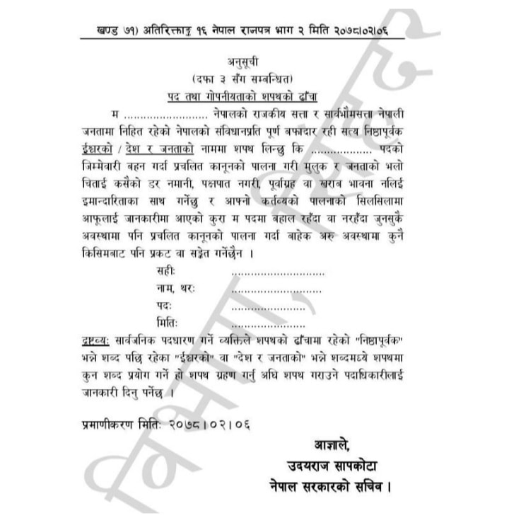 नयाँ ढाँचामा ‘प्रतिज्ञा गर्दछु’ भन्ने शब्द हटाएर ‘सपथ लिन्छु’ भन्ने राखिएको छ ।