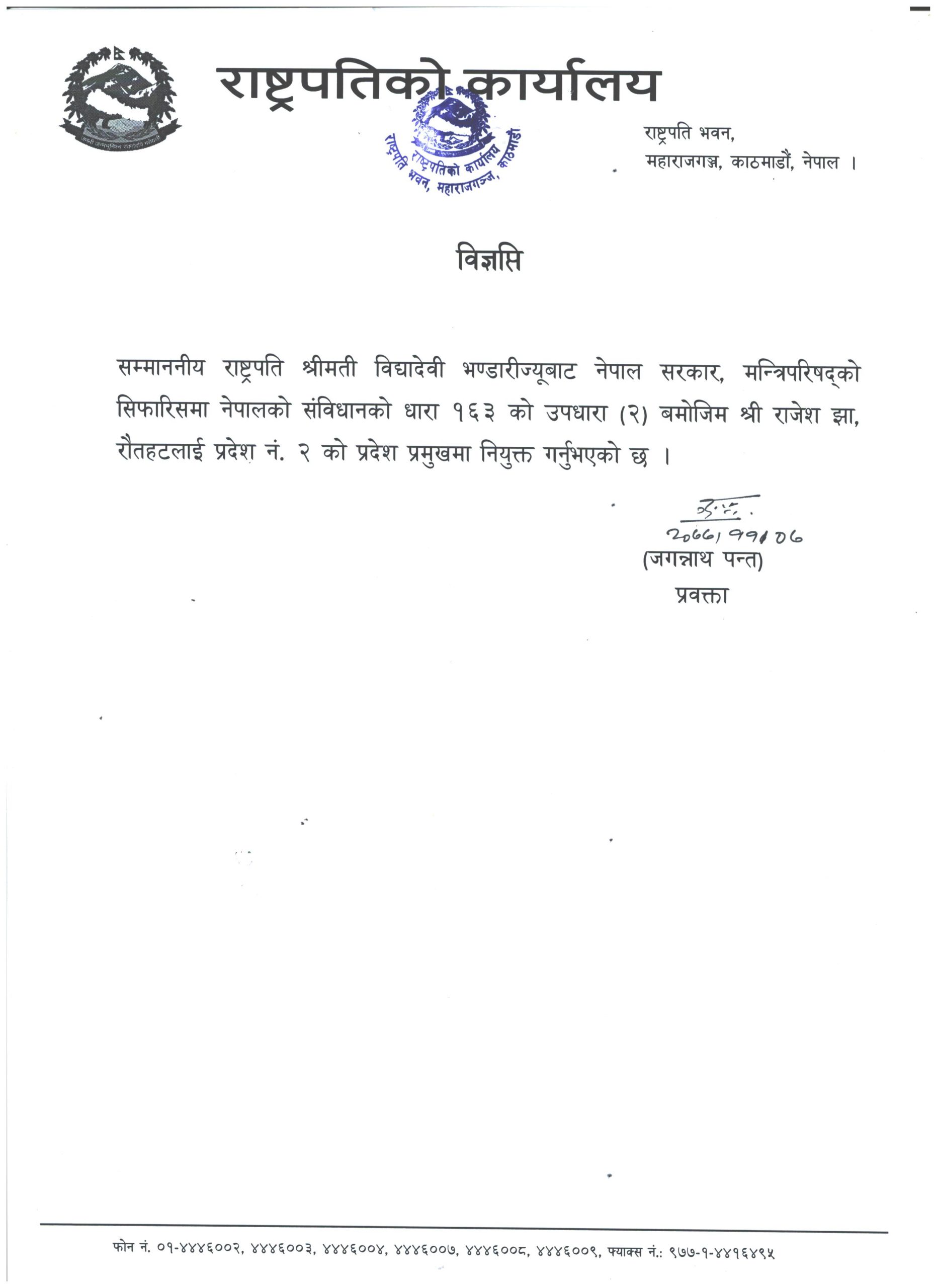 राष्ट्रपतिबाट प्रदेश २ को प्रदेश प्रमुखमा राजेश झा नियुक्त