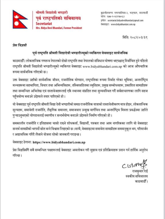 वेबसाइटमा पूर्वराष्ट्रपतिको सार्वजनिक जीवन, राजनीतिक योगदान, राष्ट्रपतिको भूमिकाका साथसाथै अन्तर्राष्ट्रिय मञ्चहरूमा सहभागिता, विचार–अभिव्यक्तिहरू, तस्वीर सहितका स्मृतिहरू, प्रमुख सम्बोधनहरू, प्रकाशित सामग्रीहरू तथा अन्य सम्बन्धित अभिलेखहरू समेटएको उनका स्वकीय सचिव राजकुमार राईले जानकारी दिए ।
