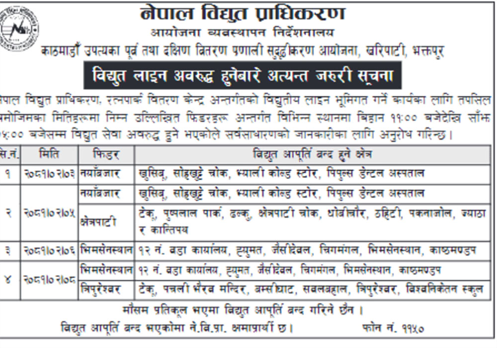 नेपाल विद्युत् प्राधिकरणको रत्नपार्क वितरण केन्द्र अन्तर्गतको विद्युतीय लाइन भूमिगत गर्ने भएकोले उपत्यकाको विभिन्न स्थानमा विद्युत् आपूर्ति अवरुद्ध हुने भएको हो ।