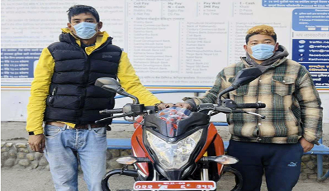 मोटरसाइकल बझाङ घर भएका विजयराज उपाध्यायले गत मंसिर ४ गते काठमाण्डुको कीर्तिपुरबाट हराएको भनी काठमाण्डु उपत्यका ट्राफिक प्रहरी कार्यालयमा खोजतलासको लागि निवेदन दिएका थिए । नियन्त्रणमा आएका दुवै जनालाई आवश्यक अनुसन्धानका लागि प्रहरी वृत्त कीर्तिपुर पठाइएको काठमाण्डु उपत्यका ट्राफिक प्रहरी कार्यालयका प्रवक्ता प्रहरी उपरीक्षक सञ्जयबहादुर राउतले जानकारी दिए ।
