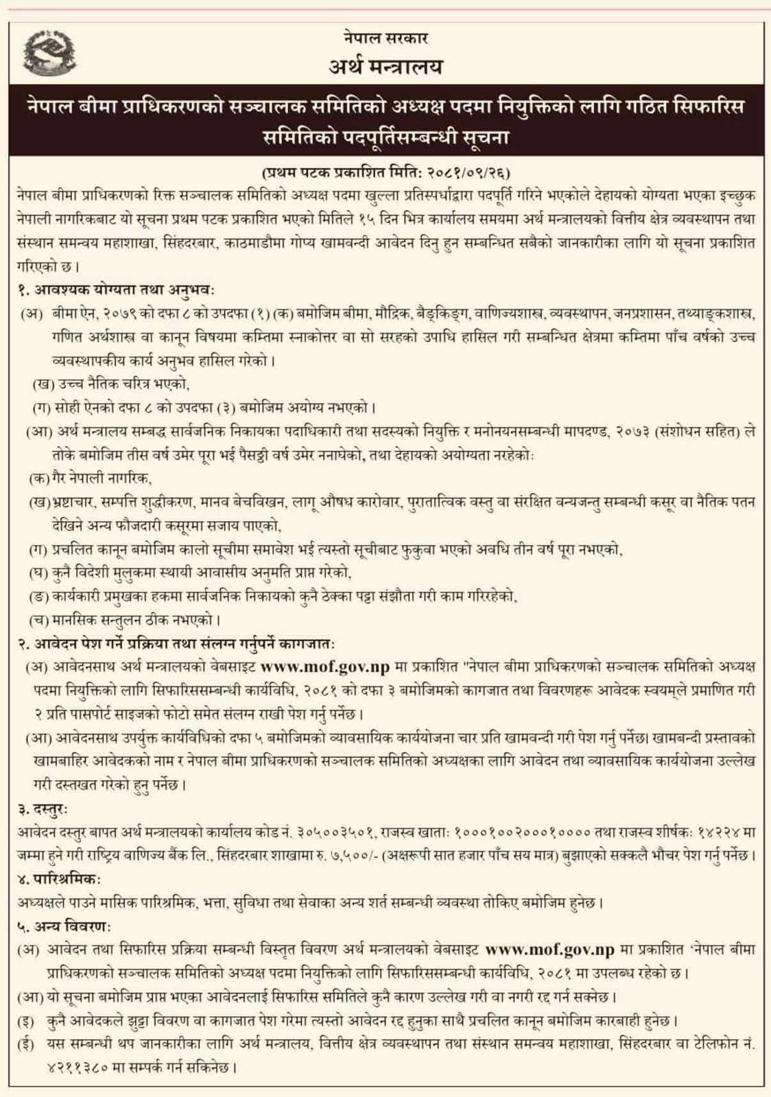 काठमाण्डु – नेपाल बिमा प्राधिकरणले अध्यक्ष पदका लागि आवेदन खुला गरेको छ । अर्थ मन्त्रालयले शुक्रबार सूचना जारी गर्दै अध्यक्षको लागि आवेदन आह्वान गरेको हो।