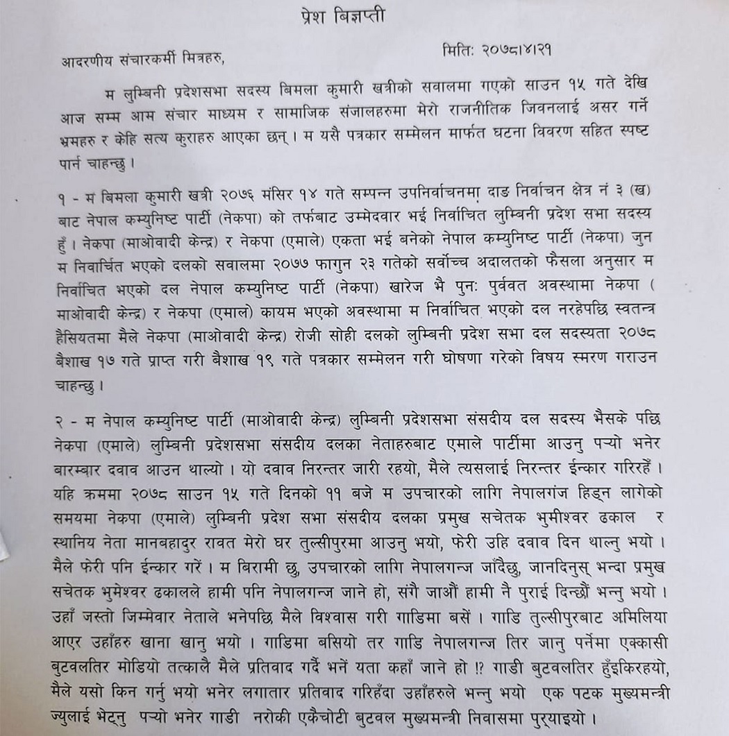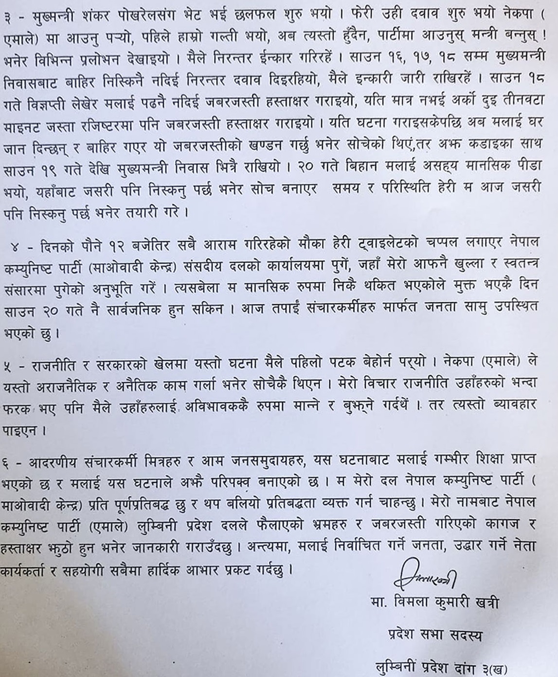 ‘साउन १८ गते विज्ञप्ती लेखेर मलाई पढ्नै नदिई जबरजस्ती हस्ताक्षर गराइयो । यति मात्र नभई अर्को दुई तीन वटा माइनट जस्तो रजिष्टरमा पनि जबरजस्ती हस्ताक्षर गराइयो । यति गराइसकेपछि मलाई घर जान दिन्छन् र बाहिर गएर यो जबरजस्स्तीको खण्डन गर्छु भनेर सोचेको थिएँ । तर, अझ कडाइका साथ साउन १९ गतेदेखि मुख्यमन्त्री निवासभित्रै राखियो,’ उनले भनिन्, ‘२० गते बिहान मलाई असह्य पीडा भयो । यहाँबाट जसरी पनि निस्कनुपर्छ भनेर सोच बनाएर समय र परिस्थिति हेरी म आज जसरी पनि निस्कनु पर्छ भनेर तयारी गरें । दिनको पौने १२ बजेतिर सबै आराम गरिरहेको मौका हेरी ट्वाइलेटको चप्पल लगाएर माओादी केन्द्रको संसदीय दलको कार्यालय पुगें । जहाँ मेरो आफ्नै खुल्ला र स्वतन्त्र संसारमा पुगेको अनुभूति गरें । त्यसबेला म मानसिक रुपमा निकै थकित भएकालेले मुक्त भएकै दिन साउन २० गते नै सार्वजनिक हुन सकिन ।’