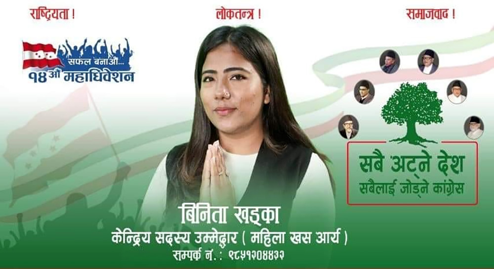 काठमाण्डु – नेपाली कांग्रेसको १४ औं महाधिवेशनमा विनिता खड्काले केन्द्रीय सदस्यमा उम्मेदवारी दिने घोषणा गरेकी छन् । रामेछापबाट महाधिवेशन प्रतिनिधि बनेकी खड्काले बिहीवार उम्मेदवारी दिने घोषणा गरेकी हुन । उनि जम्मा २६ वर्षकी भएकी छन् ।