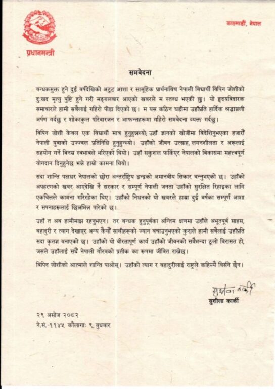 काठमाण्डु– प्रधानमन्त्री शुसीला कार्कीले विपिन जोशीको मृत्युप्रति दुःख व्यक्त गरेकी छन् । बुधबार एक प्रेस विज्ञाप्ती जारी गर्दै उनले बन्धकमुक्त हुने दुई वर्षदेखिको अटुट आशा र सामूहिक प्रार्थनाबीच नेपाली विद्यार्थी विपिन जोशीको दुःखद मृत्यु पुष्टि हुने गरी मङ्गलबार आएको खबरले एकदमै दुखि तुल्याएको बताइन् ।