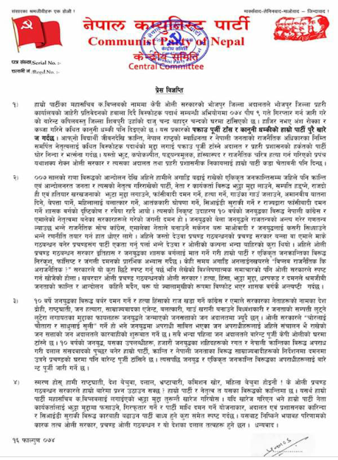 ‘ओली सरकारले ‘चोरलाई चौतारा र साधुलाई सुली’ गर्ने हो भने जनयुद्धमा अपराधी सावित भएका जनअपराधीलाई अहिले सञ्चालन भइराखेको जनसत्ताको जनअदालतले कारबाहीको शुरुवात गर्नेछ। सबैभन्दा पहिला जनअदालतले वारेन्ट पूर्जी केपी ओलीको घरमा टाँस्नेछ’, विज्ञप्तिमा भनिएको छ।