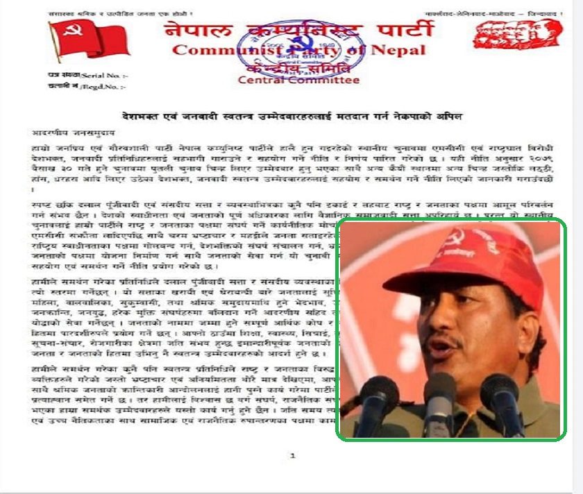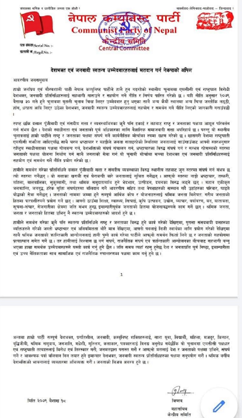 उनले भनेका छन्, ‘हाम्रो जनप्रिय एवम् गौरवशाली पार्टी नेपाल कम्युनिष्ट पार्टीले हालै हुन गैरहेको स्थानीय चुनावमा एमसीसी एवम् राष्ट्रघात विरोधी देशभक्त, जनवादी प्रतिनिधिहरूलाई सहभागी गराउने र सहयोग गर्ने नीति र निर्णय पारित गरेको छ । यही नीतिअनुसार २०७९ वैशाख ३० गते हुने चुनावमा पुतली चुनाव चिन्ह लिएर उम्मेदवार हुनुभएका साथै अन्य कयौं स्थानमा अन्य चिन्ह जस्तो कि लठ्ठी, हाँस, धरहरा आदि लिएर उठेका देशभक्त, जनवादी स्वतन्त्र उम्मेदवारहरूलाई सहयोग र समर्थन गर्ने नीति लिएको जानकारी गराउँदछौं ।’