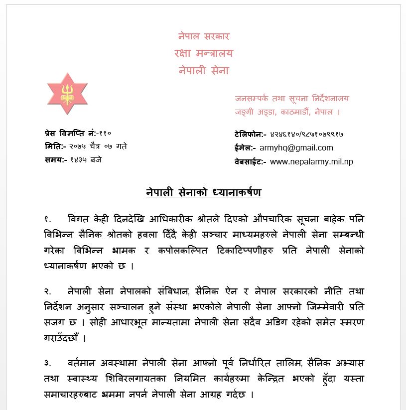 जनसम्पर्क तथा सूचना निर्देशनालय जंगी अड्डाद्धारा जारी विज्ञप्तिमा भनिएको छ, ‘नेपाली सेना नेपालको विधान, सैनिक ऐन र नेपाल सरकारको नीति तथा निर्देशन अनुसार सञ्चालन हुने संस्था भएकाले नेपाली सेना आफ्नो जिम्मेवारीप्रति सजग छ। सोही आधारभूत मान्यतामा नेपाली सेना सदैव अडिग रहेको समेत स्मरण गराउँछौं।’