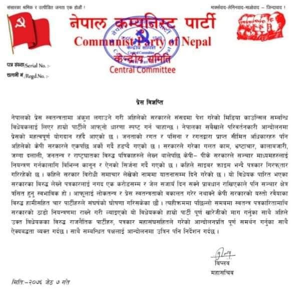 नेपालमा प्रेस स्वतन्त्रतामाथि अंकुस लगाउने गरि सरकारले संसदमा पेस गरेको मिडिया काउन्सिल सम्बन्धी विद्येयकलाई लिएर विप्लवले मंगलबार एक विज्ञप्ति जारी गर्दै विप्लवले नेपालका जनताको रगत र पसिना र रगतद्वारा प्राप्त सीमित अधिकारहरु पनि अहिलेको केपी सरकारले एकपछि अर्को गर्दै हडप्दै गएको बताएको छ