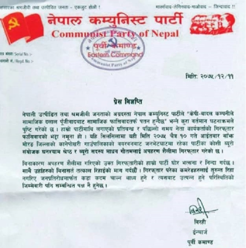 पार्टीका पूर्वी कमान्ड इन्चार्ज विरहीले सोमबार जारी गरेको विज्ञप्तिमा ‘केपी–बादल कम्पनी सामाजिक दलाल पूँजीवादबाट सामाजिक फासिवादतर्फ पतन हुँदैछ,’ भनिएको छ।