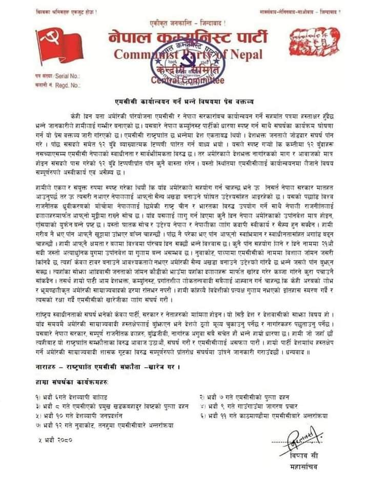 विज्ञप्तिमा उल्लेख छ, ‘अमेरिकाले सहयोग गर्न चाहन्छ भने ऊ निशर्त नेपाल सरकार मातहत आउनुपर्छ तर ऊ त्यसरी नआएर नेपाललाई आफ्नो सैन्य अखडा बनाउने घोषित उद्देश्यसहित आइरहेको छ ।’