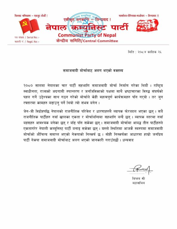 उनले विज्ञप्ति मार्फत भनेका छन्, ‘सबै राजनीतिक पार्टीहरु नयाँ खालका एकता र मोर्चाबन्दिमा सहभागि बन्दै छन् । व्यापक स्तरमा नयाँ बहसहरु आवश्यक बनेका छन् र बढि पनि सकेका छन् । समाजवादी मोर्चामा आबद्ध तीन पार्टीहरुले एकतागरेर नेपाली कम्युनिस्ट पार्टी बनाइ सकेका छन् । यस्तो स्थितिमा आजकै स्वरुपमा समाजवादी मोर्चाको औचित्य समाप्त भएको नेकपाको निस्कर्ष छ ।’