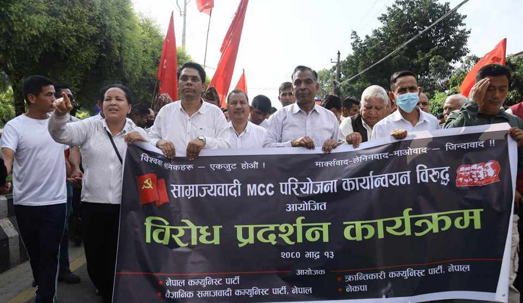 बुधबार सरकारले एमसीसी कार्यान्वयन प्रक्रिया अगाडि बढाउँदा विप्लव र धर्मेन्द्रसहित नेताहरूले काठमाडौंको माइतीघरमा प्रदर्शन गरेका छन् ।