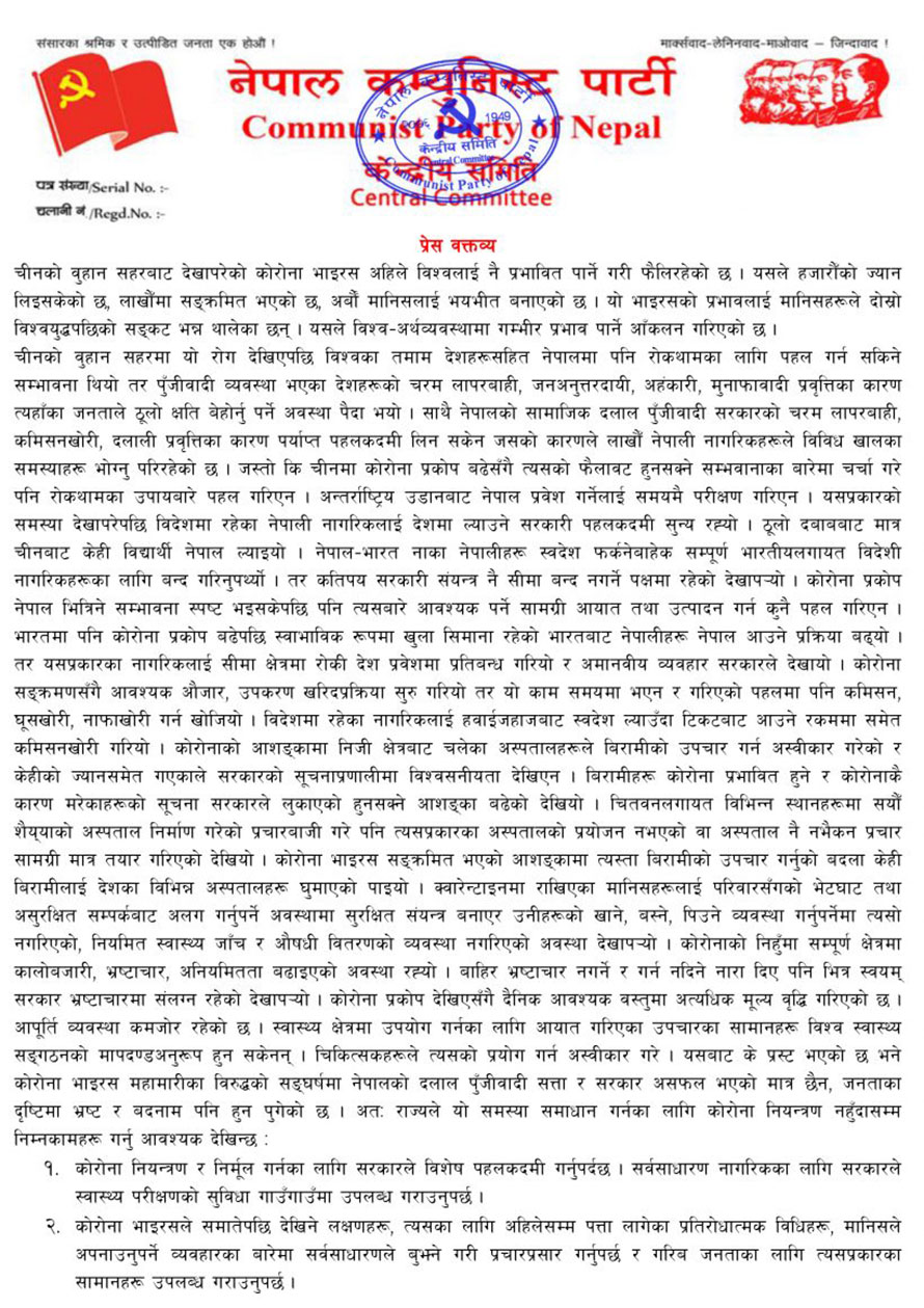 काठमाडौं – नेत्रविक्रम चन्द ‘विप्लव’ नेतृत्वको नेकपाले कोरोना भाइरस नियन्त्रणका सरकारले विशेष पहलकदमी गर्नुपर्ने माग राखेको छ ।